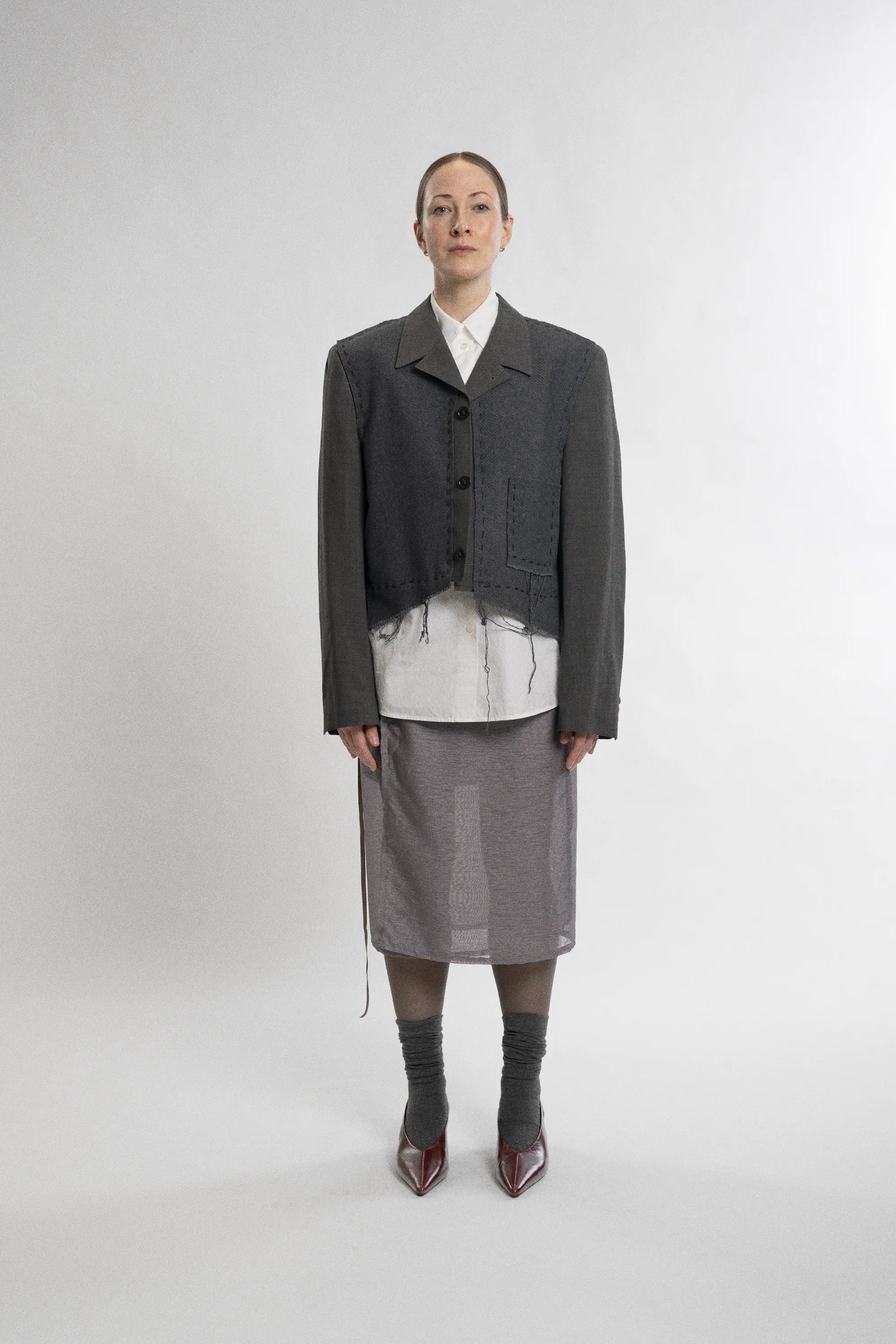 Reworked from a vintage blazer. Cropped length with added textured panels on the front, finished with visible hand stitching and raw hem detailing.
