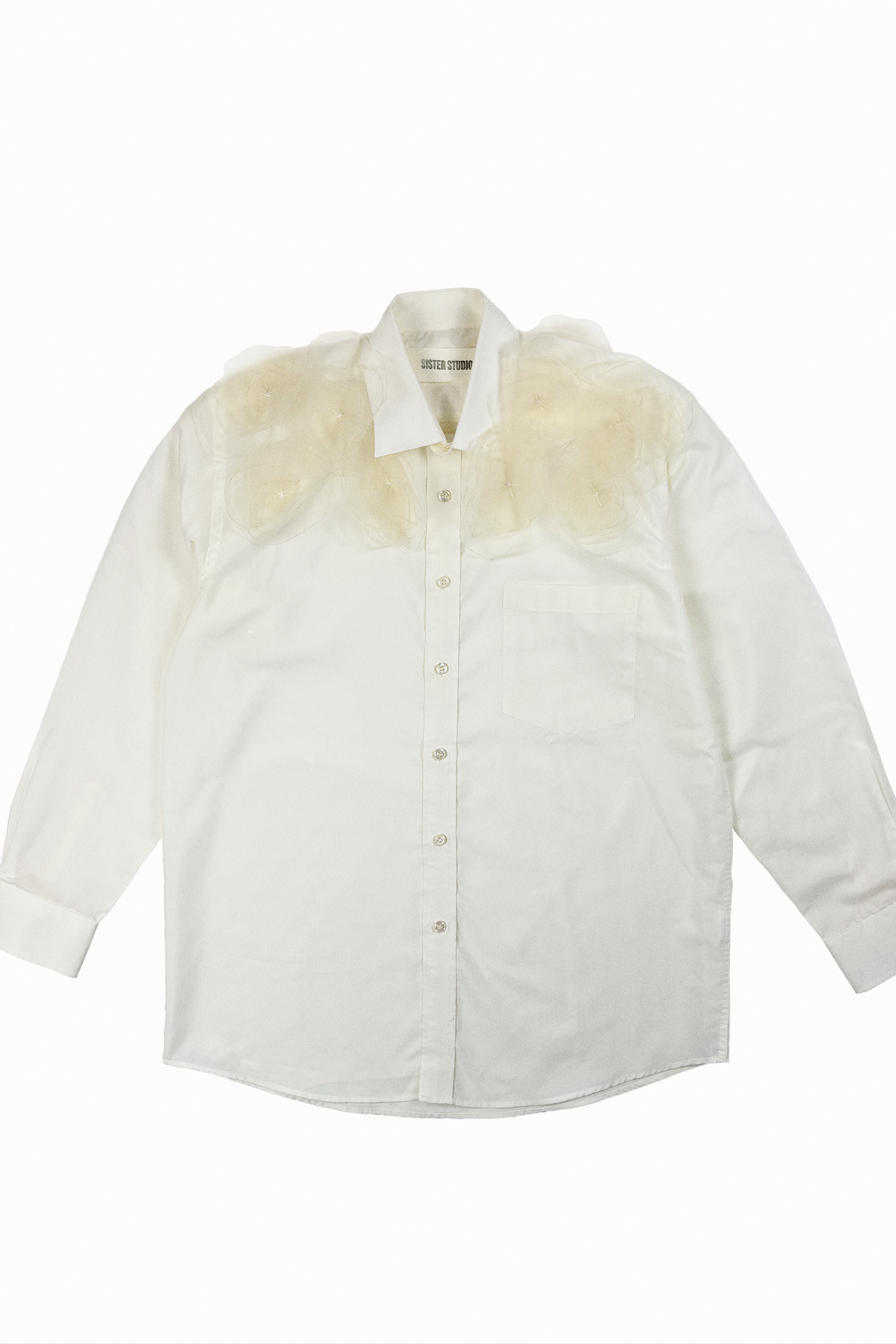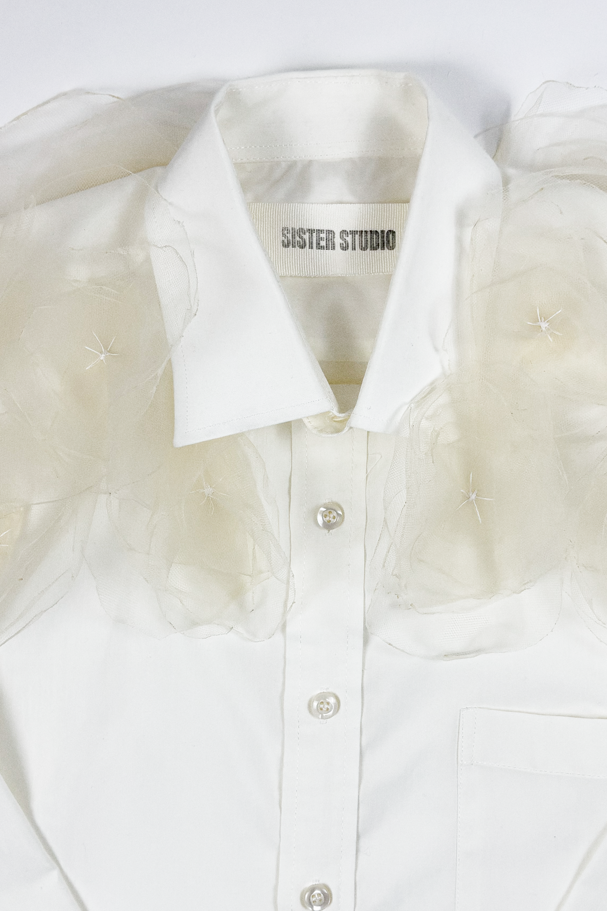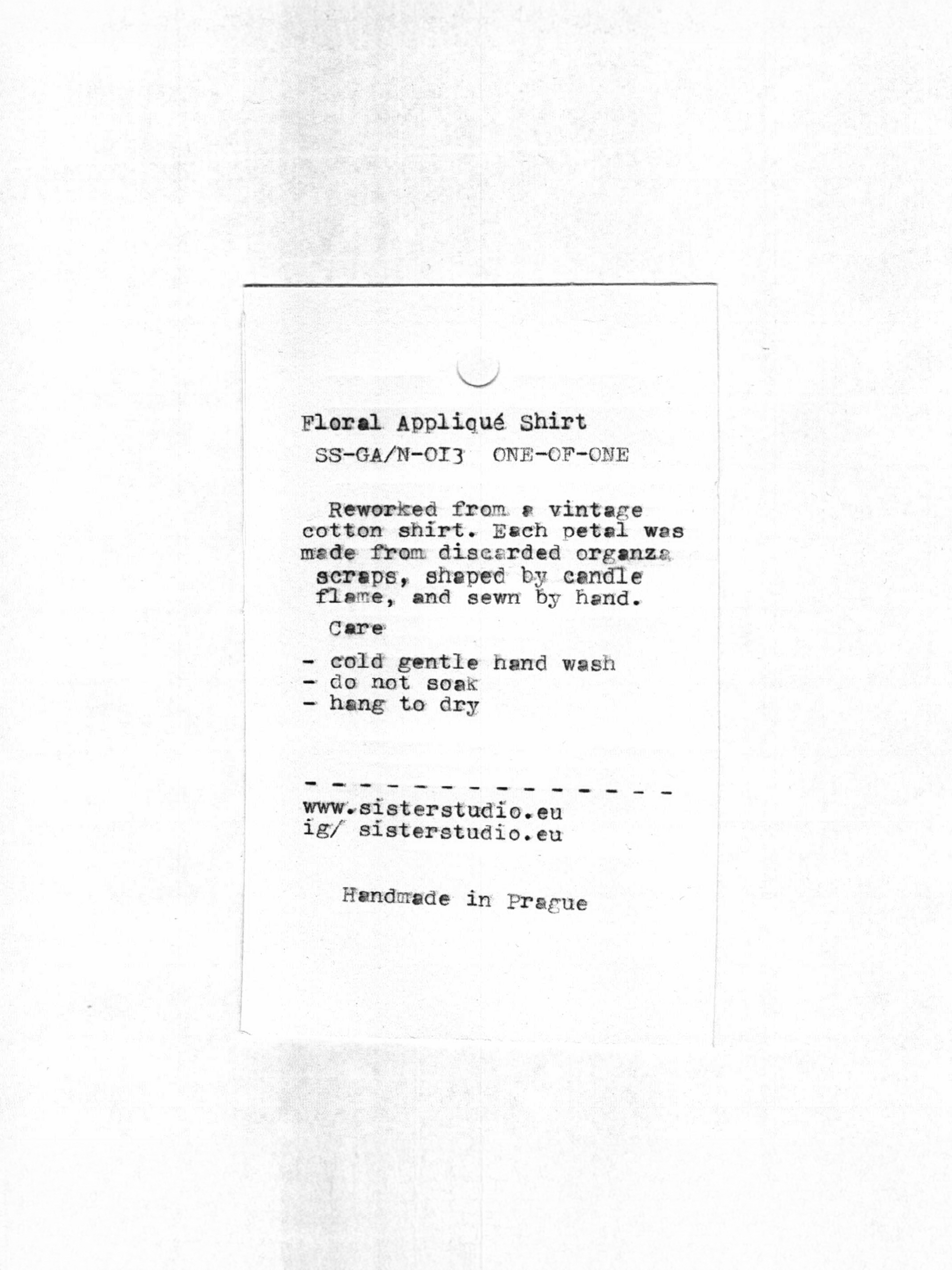 Reworked from a vintage cotton shirt. Each petal was made from discarded organza scraps, shaped by candle flame, and sewn by hand.