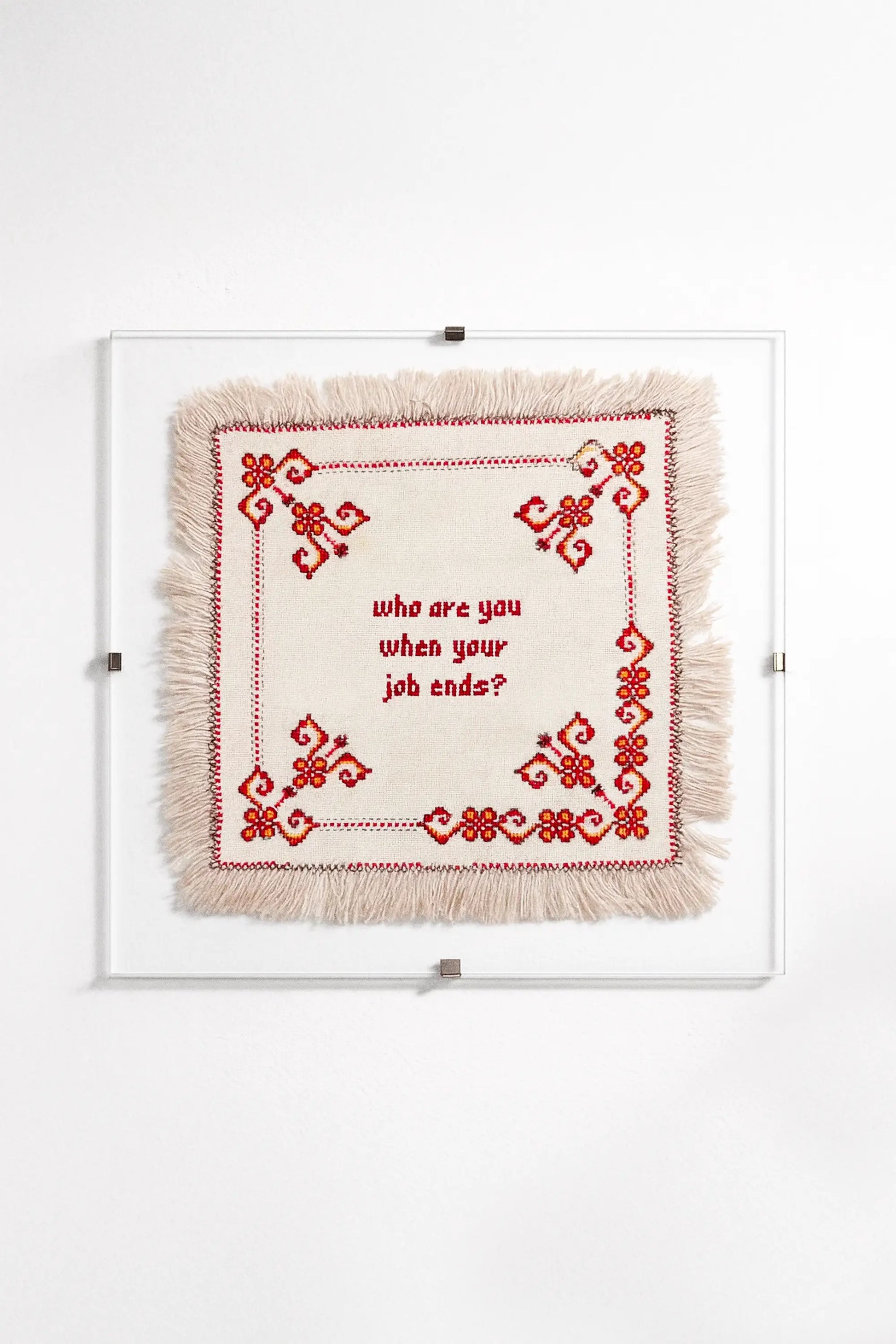 Vintage hand-embroidered textile work with added hand embroidery.