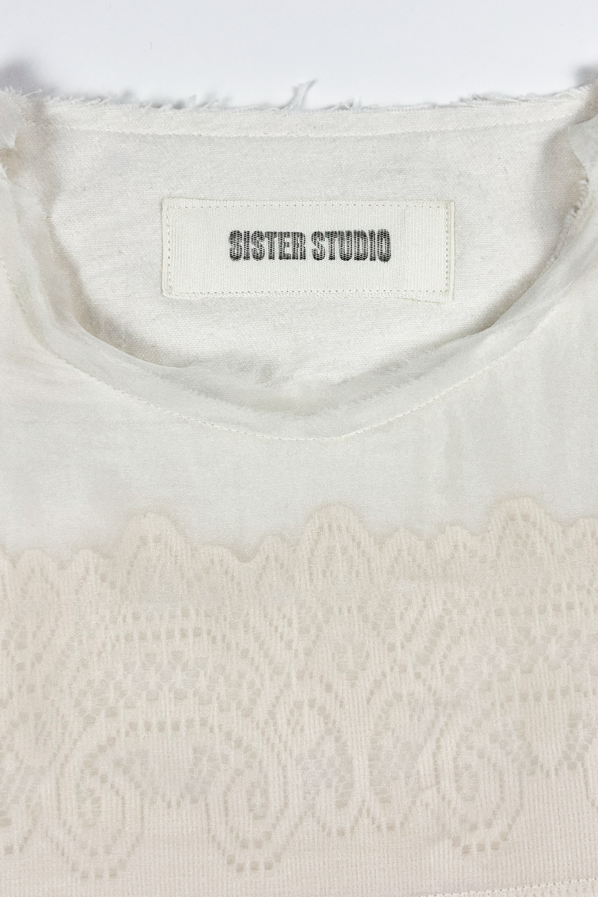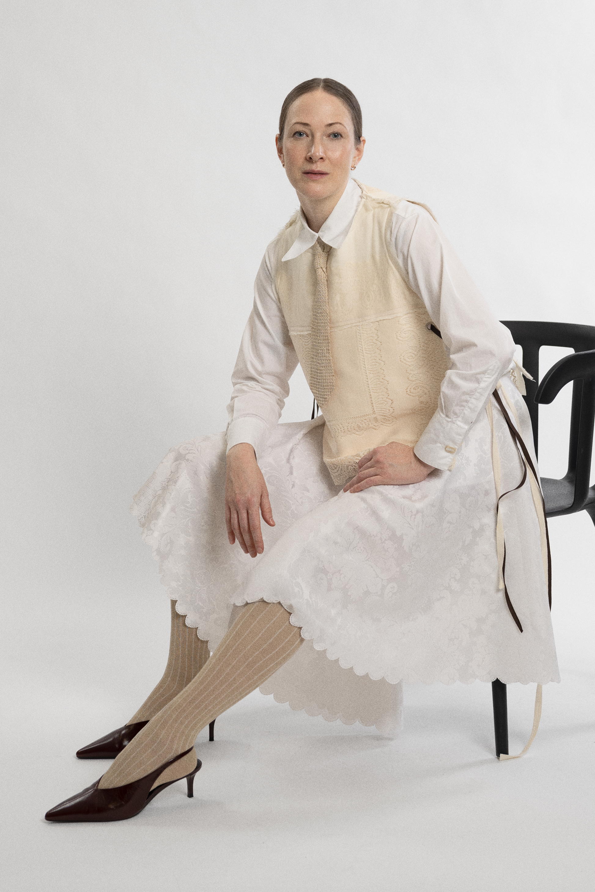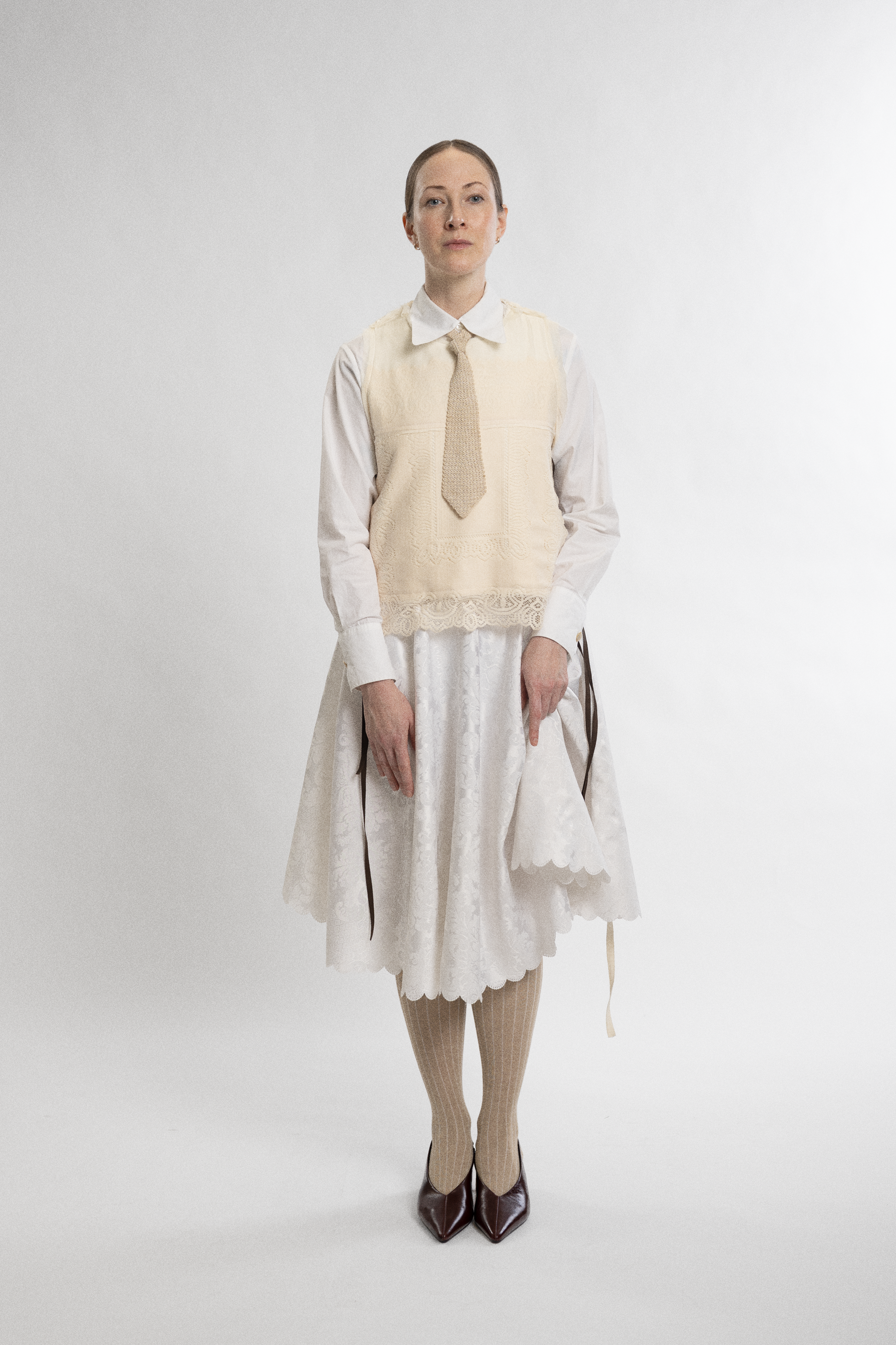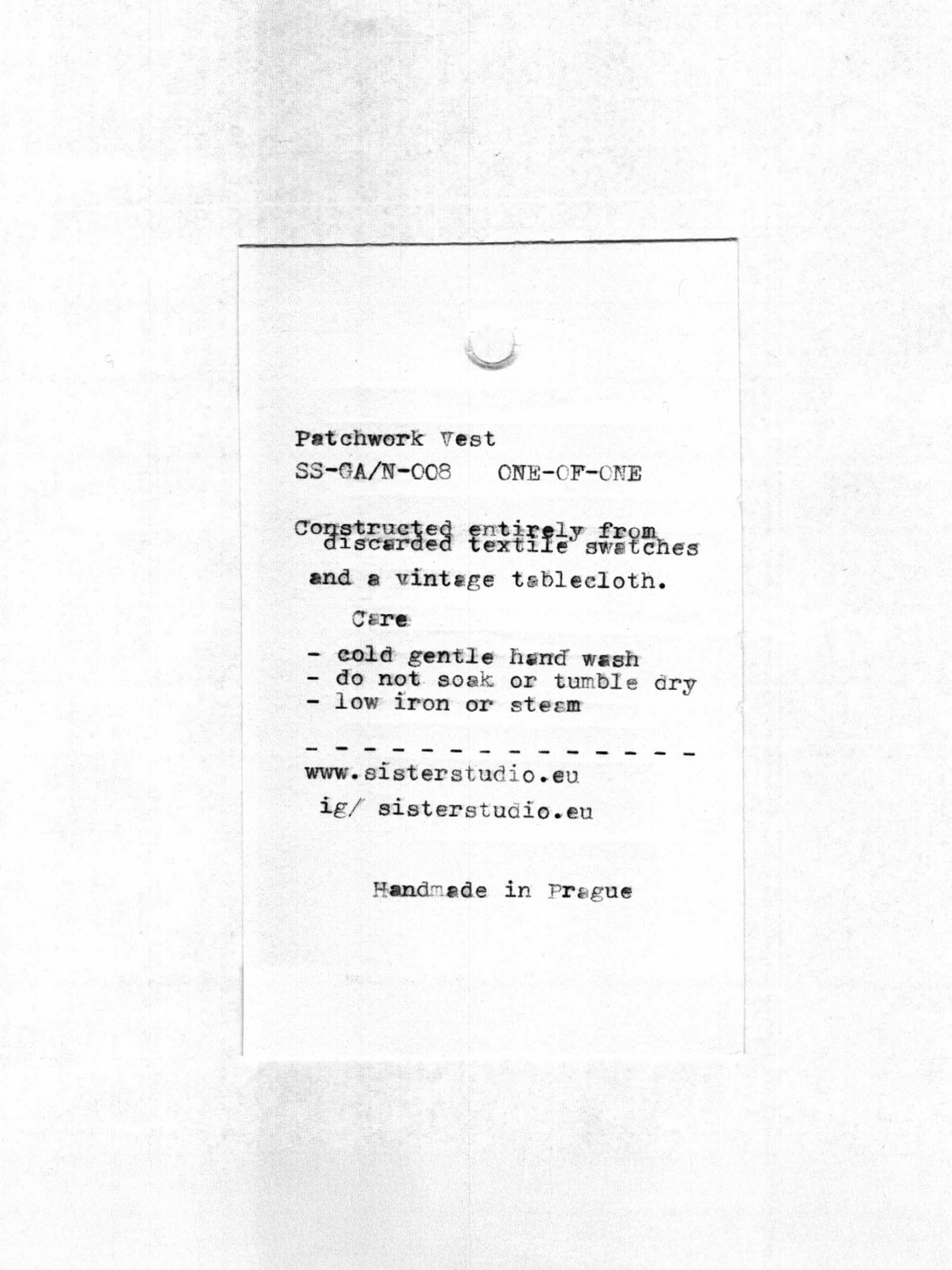 Constructed entirely from discarded textile swatches and vintage tablecloth.