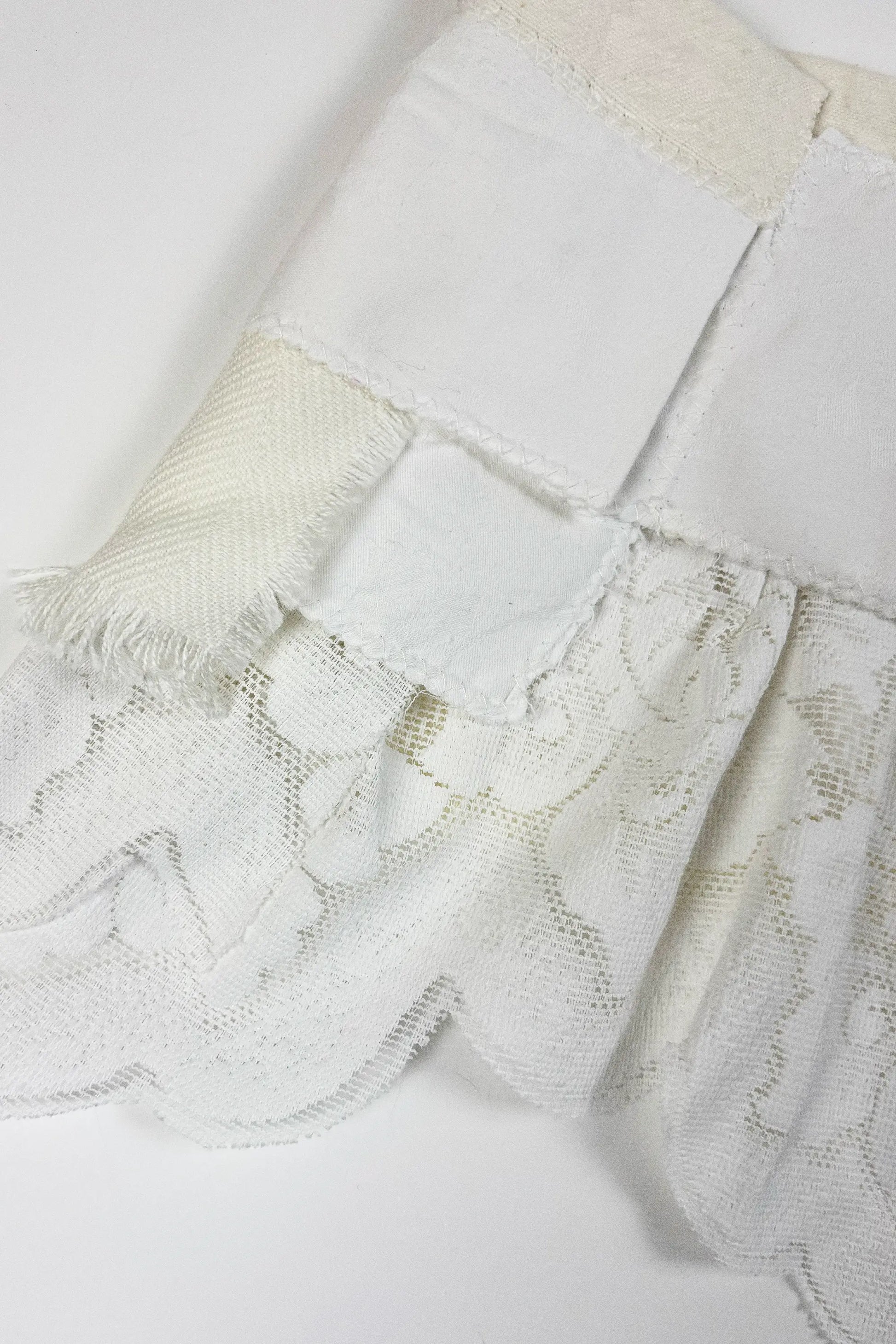 Constructed from elements of vintage curtain, cotton bedding, and tablecloth.